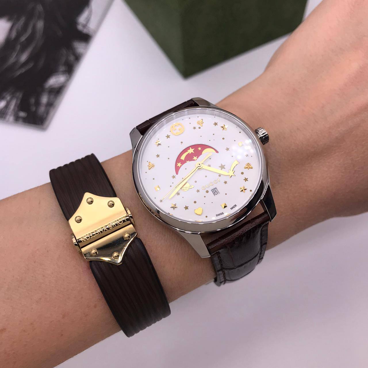 Каждая деталь часов Gucci BP-14241 говорит о безупречном вкусе и стремлении к совершенству. Уникальные элементы дизайна, такие как изысканные циферблаты и аккуратные стрелки, делают их не просто аксессуаром, а настоящим украшением. Эти часы способны стать акцентом любого наряда, придавая ему завершенность и элегантность. Они идеально подходят для женщин, которые любят выделяться из толпы и ценят уникальные вещи, способные подчеркнуть их стиль и индивидуальность.