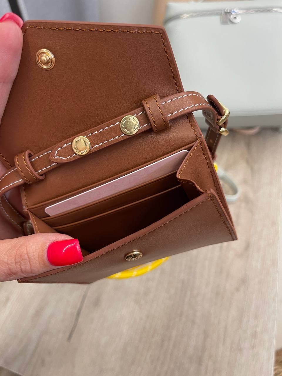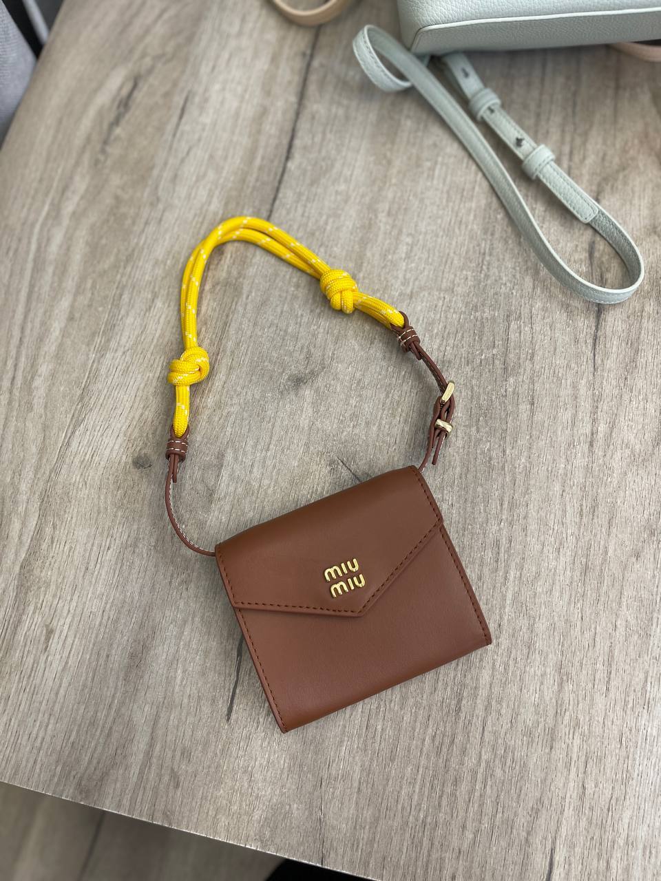 Каждая деталь этого аксессуара продумана до мелочей. Стильный брелок, который можно прикрепить к ключам или сумке, добавляет нотку шика и индивидуальности. Сложный дизайн и утонченные линии делают его не просто полезным предметом, но и элементом стиля, который подчеркивает ваш статус и вкус. Мастера Miu Miu, известные своим вниманием к деталям, создали этот картхолдер, чтобы он стал неотъемлемой частью вашего образа, дополняя его изысканностью и современными акцентами.