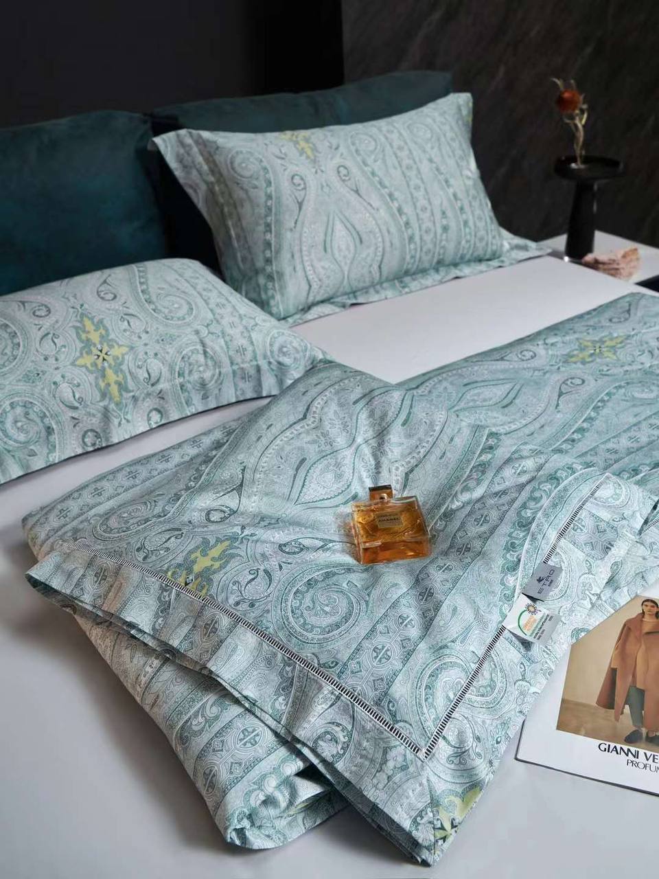 В мире люксовой моды каждый элемент интерьера становится отражением индивидуальности и стиля. Стальной-синий комплект белья Etro BP-51850 — это не просто текстиль для дома, а настоящая находка для тех, кто ценит изысканность и качество. Этот комплект, созданный известным брендом Etro, идеально подходит для создания атмосферы уюта и элегантности в вашем доме. Вдохновленный традициями итальянского дизайна, он сочетает в себе богатство оттенков и уникальные узоры, которые придают спальне особый шарм и стиль.