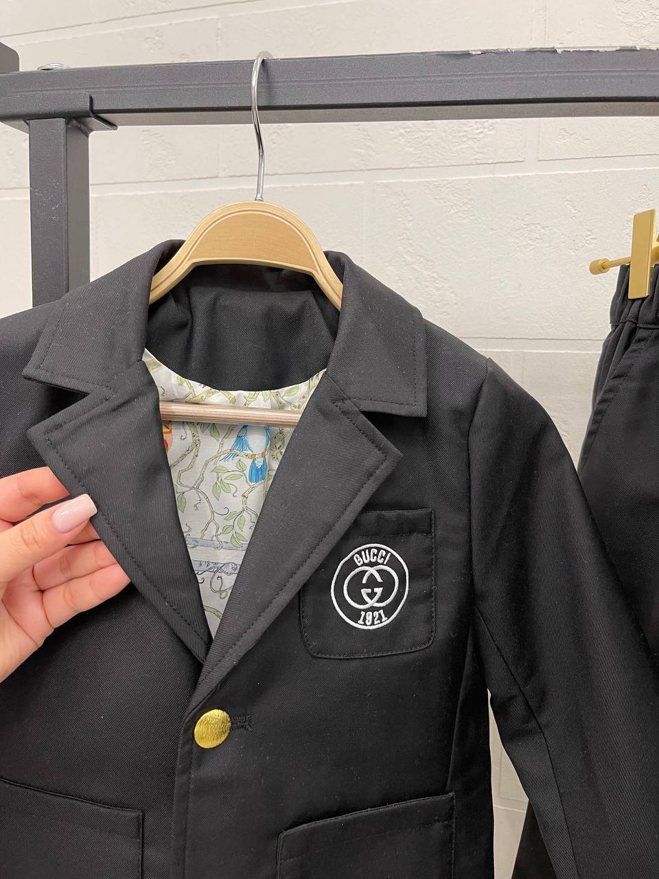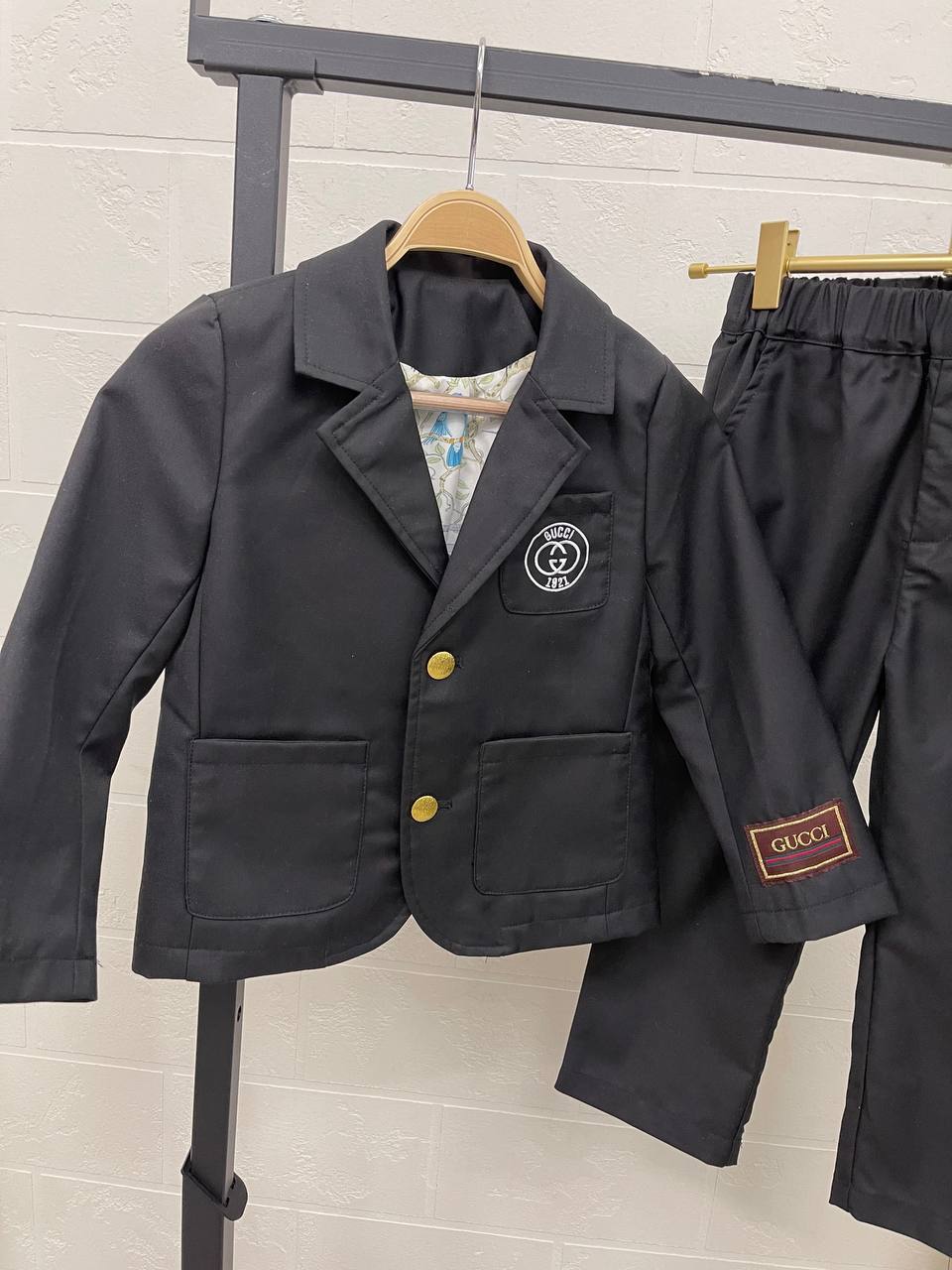 Костюм включает в себя классическую пиджак и брюки, которые прекрасно сочетаются друг с другом, создавая гармоничный образ. Дизайн костюма отличается изысканными линиями и современными акцентами, что позволяет мальчику выглядеть уверенно и стильно в любой ситуации. Яркие детали и уникальная отделка делают этот наряд настоящим произведением искусства, которое не оставит равнодушными ни детей, ни их родителей. Gucci всегда ставит перед собой высокие стандарты, и этот костюм не стал исключением, предлагая маленьким модникам возможность выделяться на фоне сверстников.