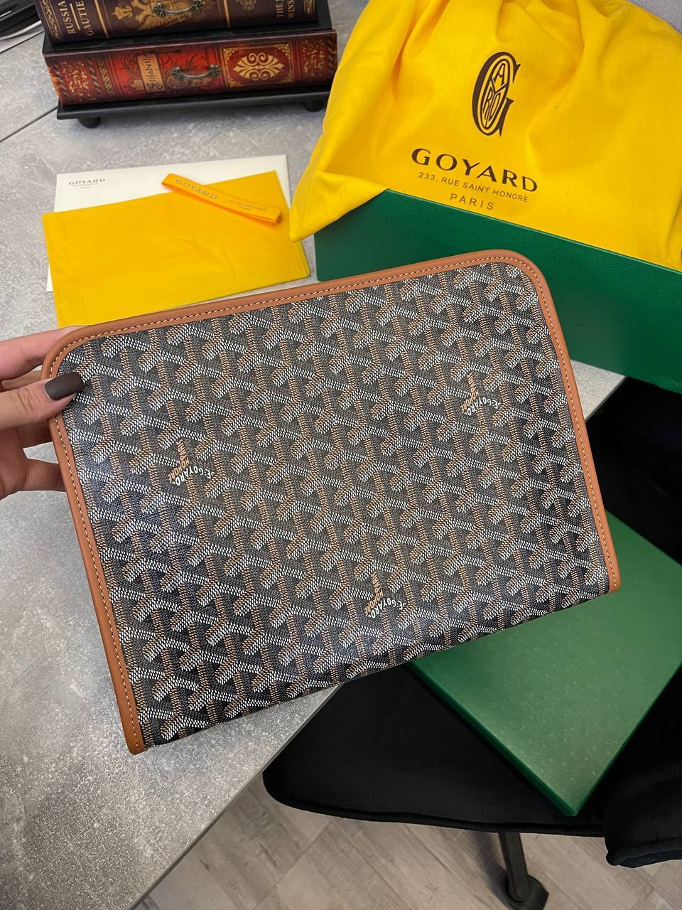 Каждый элемент этой папки продуман до мелочей. Внутреннее пространство позволяет удобно разместить документы, визитные карточки и другие важные мелочи, что делает её идеальной для деловых встреч и путешествий. Эстетика Goyard проявляется не только в дизайне, но и в использовании традиционных ремесленных техник, которые делают каждую папку поистине уникальной. Мужчины, выбирающие этот аксессуар, могут быть уверены, что они делают ставку на качество и безупречный стиль, который будет актуален в любой ситуации.