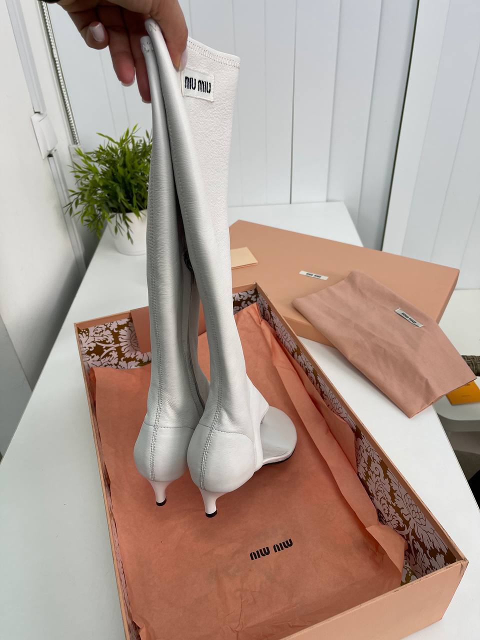 Эластичная кожа наппа, из которой изготовлены сапоги, обеспечивает не только стильный внешний вид, но и комфорт при носке. Мягкость материала позволяет обуви идеально облегать ногу, создавая ощущение второй кожи. Это особенно важно для тех, кто ценит не только красоту, но и удобство в обуви. Miu Miu, как известный бренд, всегда ставит акцент на высокое качество своих изделий, и эта модель не стала исключением. Сапоги-стринги прекрасно подойдут как для мужчин, так и для женщин, что делает их универсальным предметом гардероба.