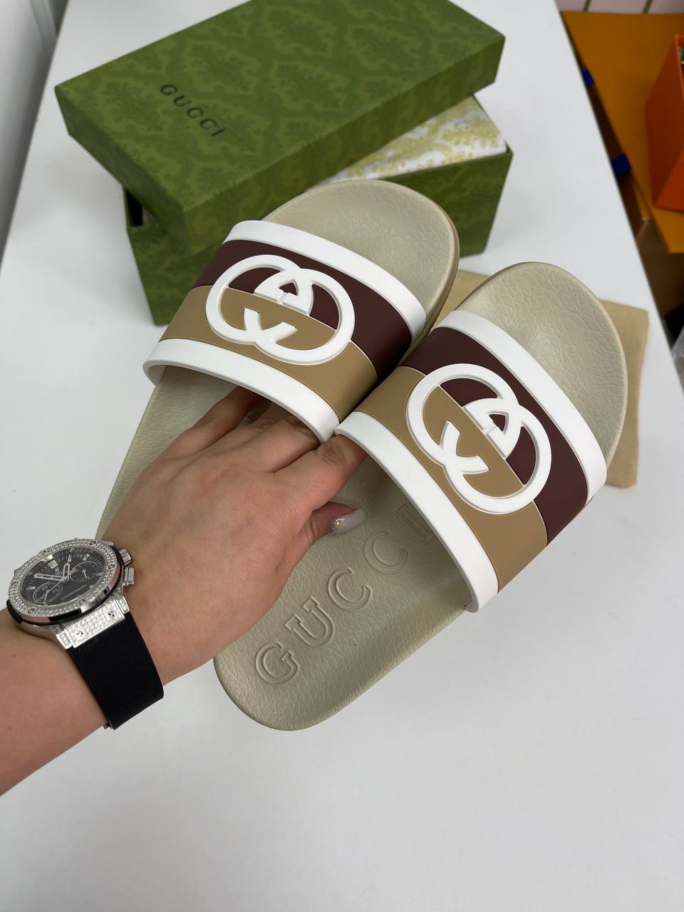 Каждая деталь шлепанцев Gucci BP-31155 продумана до мелочей. Элегантные линии и яркие акценты делают их настоящим произведением искусства, которое будет радовать глаз и вдохновлять на новые модные эксперименты. Эти шлепанцы идеально подходят для летних прогулок, пляжных вечеринок или даже для уютных встреч с друзьями. Они станут не просто обувью, а настоящим символом вашего статуса и безупречного вкуса.