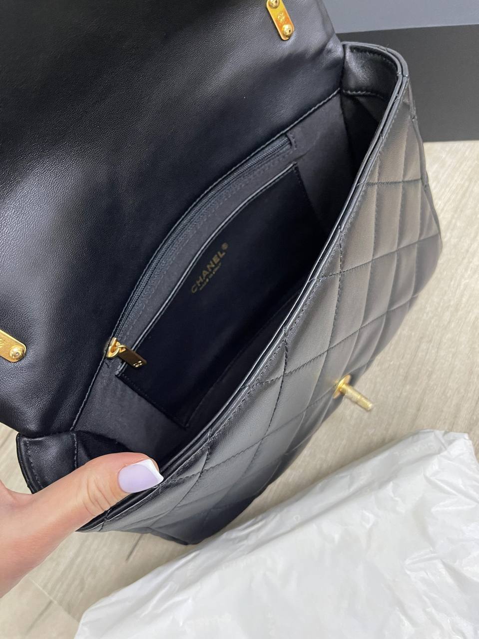 Внутреннее пространство сумки продумано так, чтобы удовлетворить потребности современных женщин. Удобные карманы и отделения позволяют организовать все необходимые вещи, сохраняя порядок и легкость в использовании. Вы сможете легко разместить в ней все свои аксессуары, косметику и другие мелочи, не теряя при этом в стиле. Эстетика Chanel всегда была на высоте, и эта модель не исключение. Выбор материалов, текстур и фурнитуры создает гармоничный образ, который будет радовать глаз и вдохновлять на новые модные эксперименты.