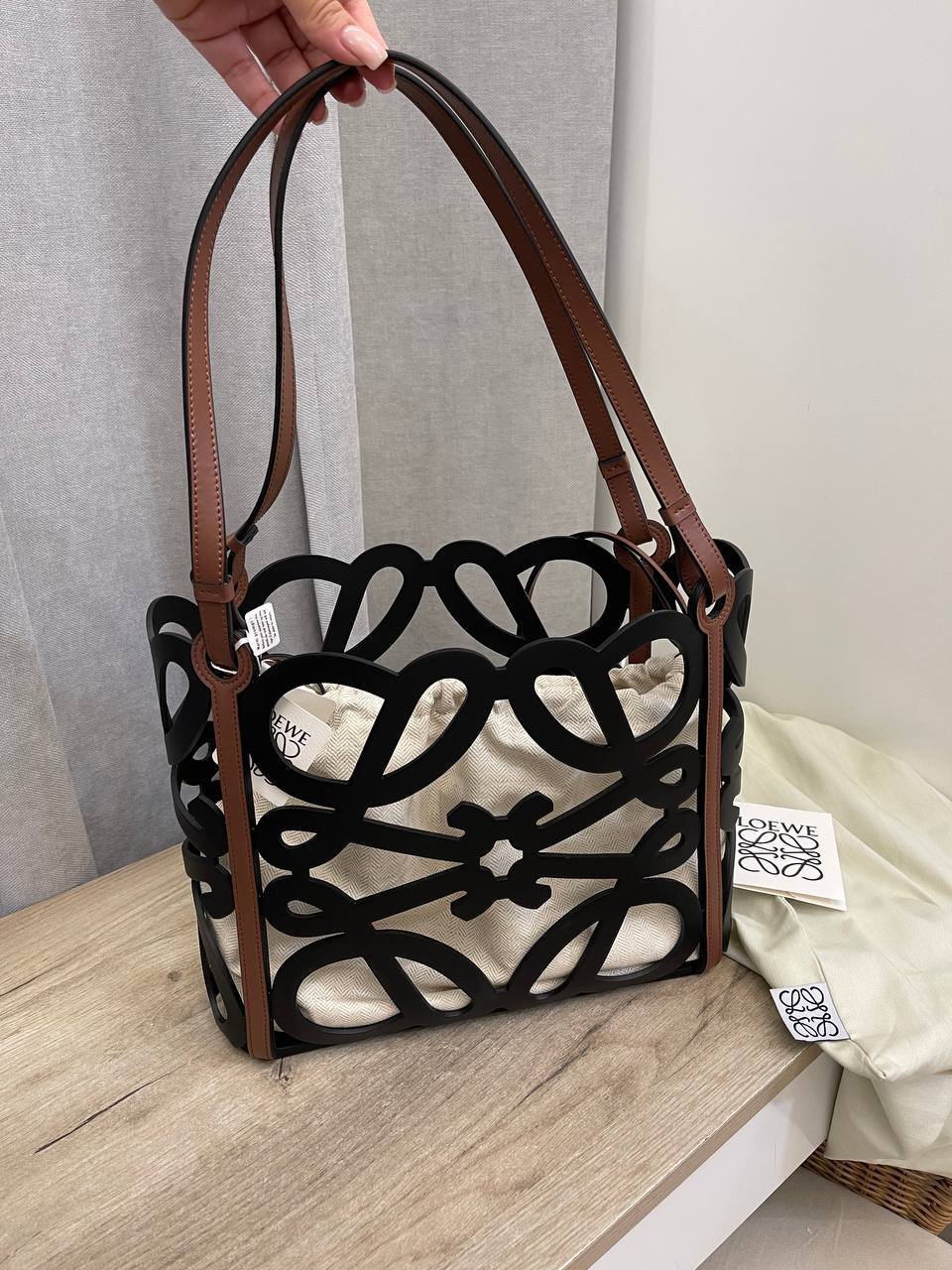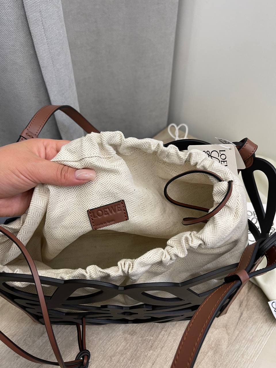 Сумка Loewe BP-51916 станет незаменимым аксессуаром для повседневных выходов, а также для особых случаев. Она легко сочетает в себе функциональность и стиль, позволяя носить все необходимые вещи, не жертвуя при этом визуальной привлекательностью. Женщина, обладающая этой сумкой, чувствует себя уверенно и стильно в любой ситуации, будь то деловая встреча или вечерняя прогулка. Элитная женская сумка Loewe — это не просто тренд, это инвестиция в собственный стиль и комфорт.