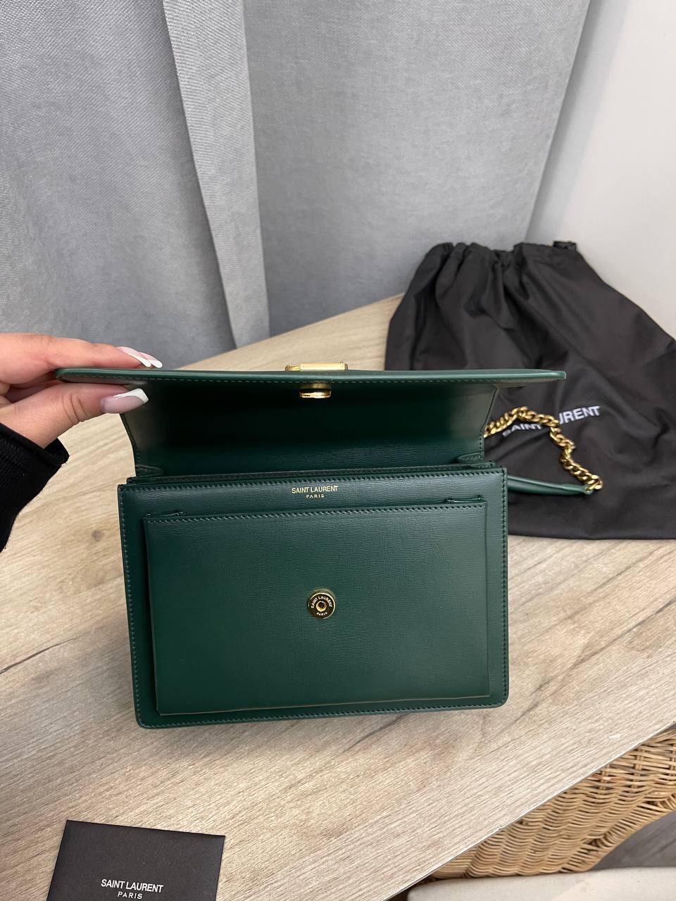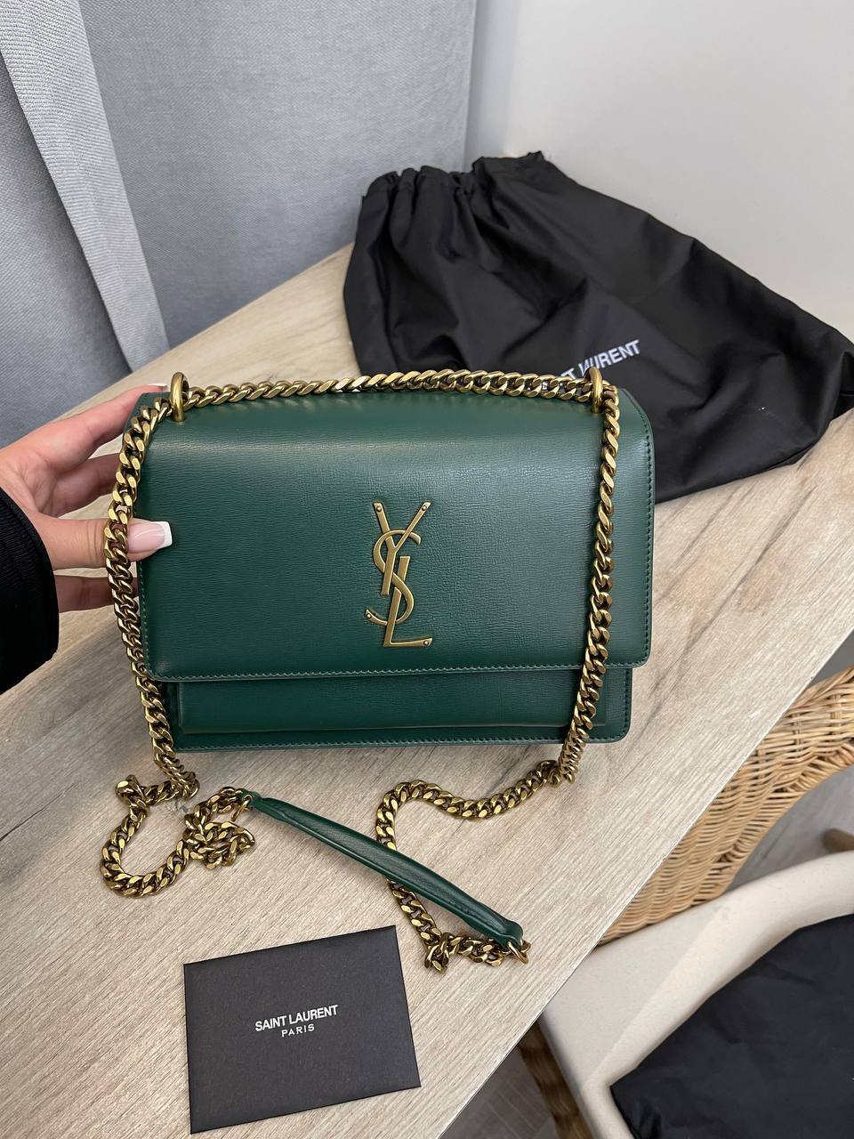 Темно-зеленая сумка через плечо от Yves Saint Laurent — это не просто модный аксессуар, а настоящая инвестиция в стиль. Она способна дополнить как деловой, так и повседневный наряд, добавляя изюминку и нотку роскоши. Благодаря продуманной конструкции и удобному ремешку, сумка легко адаптируется к любым условиям, позволяя своей обладательнице чувствовать себя комфортно и уверенно в любой ситуации. Этот предмет гардероба станет надежным спутником для современных женщин, ценящих качество и стиль.