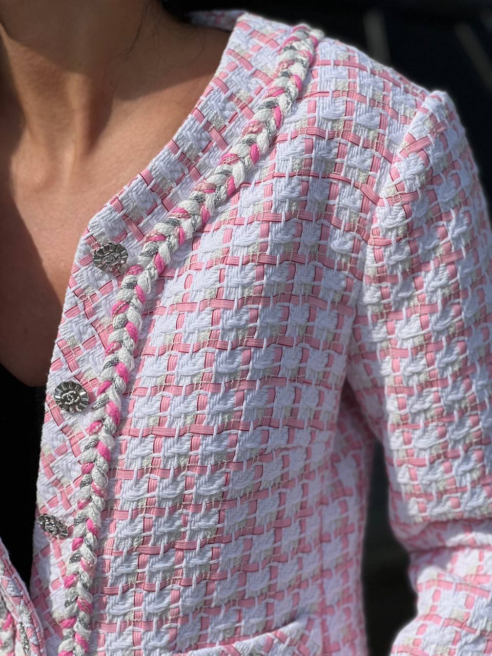 Каждая деталь жакета говорит о высоком уровне мастерства, присущем бренду Chanel. Уникальные линии кроя создают силуэт, который идеально ложится на фигуру, а утонченные отделки добавляют нотку роскоши. Этот жакет станет идеальным выбором как для деловых встреч, так и для вечерних выходов, позволяя вам оставаться в центре внимания. Его универсальность делает его незаменимым элементом в гардеробе модниц, стремящихся к совершенству.