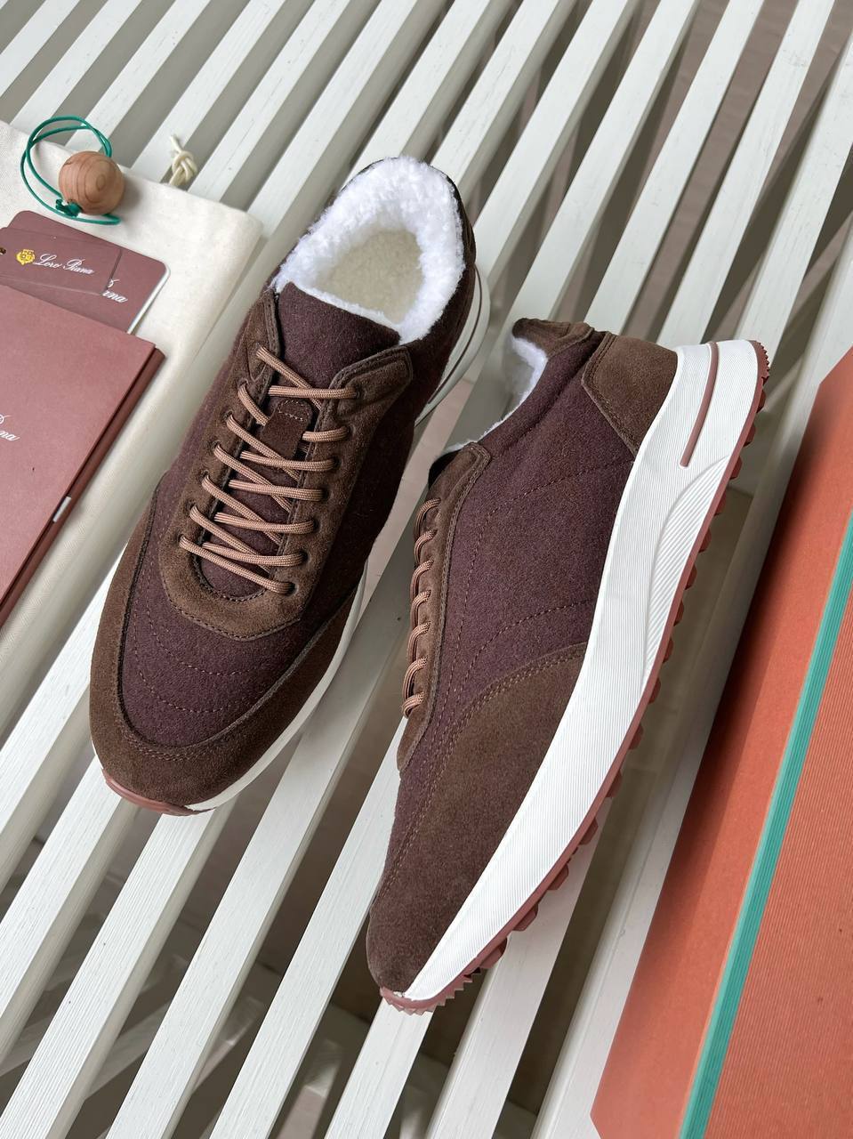 Каждая деталь этих кроссовок продумана до мелочей. Элегантный коричневый оттенок легко сочетается с различными стилями одежды, от повседневных до более строгих ансамблей. Мягкая замша обвивает стопу, создавая ощущение уюта и защищенности, что особенно важно в зимний период. Кроссовки от Loro Piana подойдут как для деловых встреч, так и для расслабленных выходных с друзьями, позволяя оставаться стильным в любых обстоятельствах.